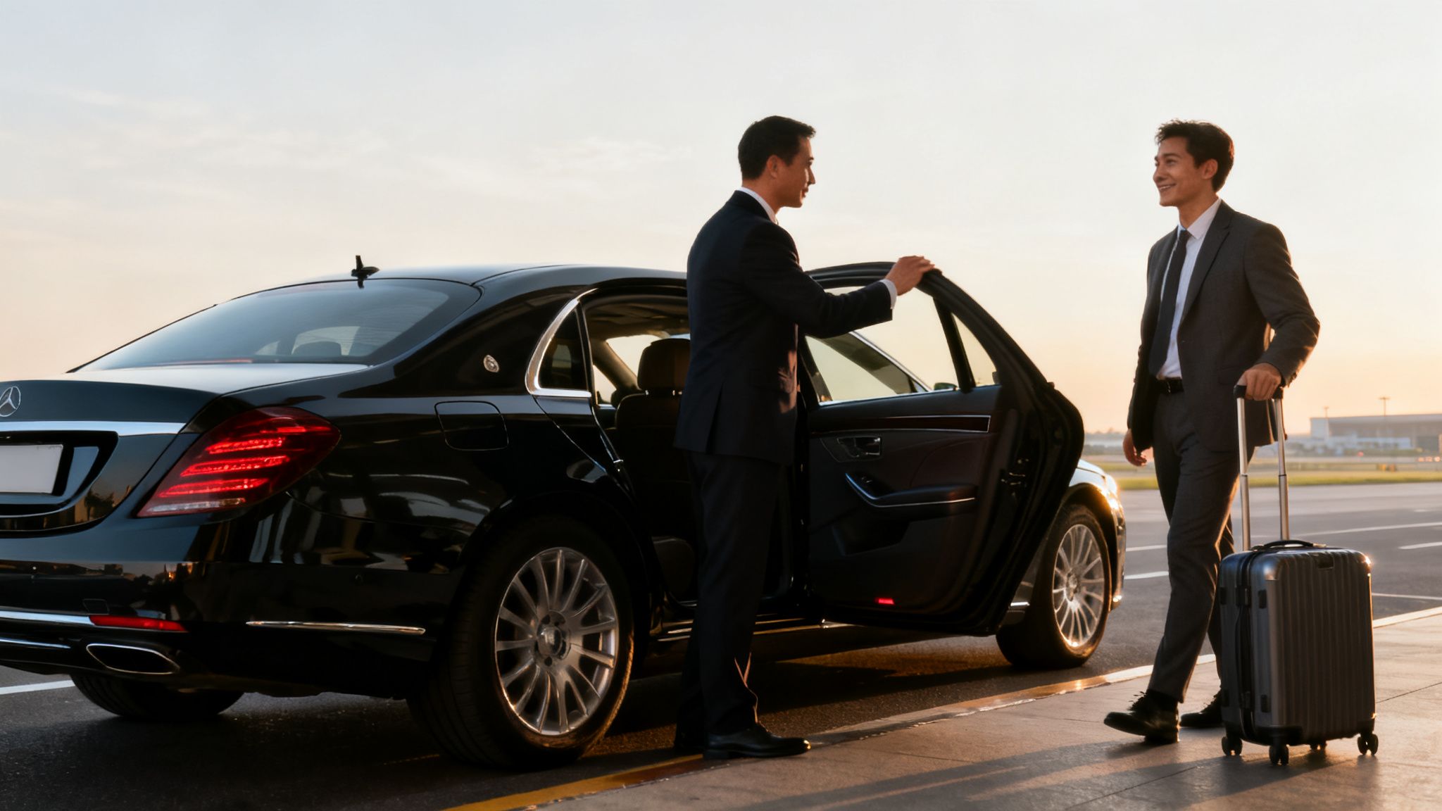 Chauffeur opens black luxury car door for businessman with luggage at airport tarmac.