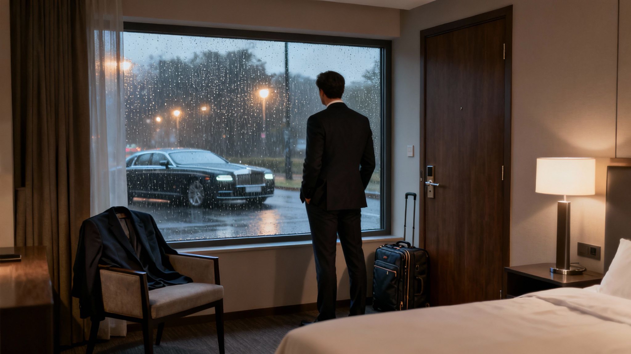 A man in a suit looks out a hotel window at a luxury car waiting in the rain.